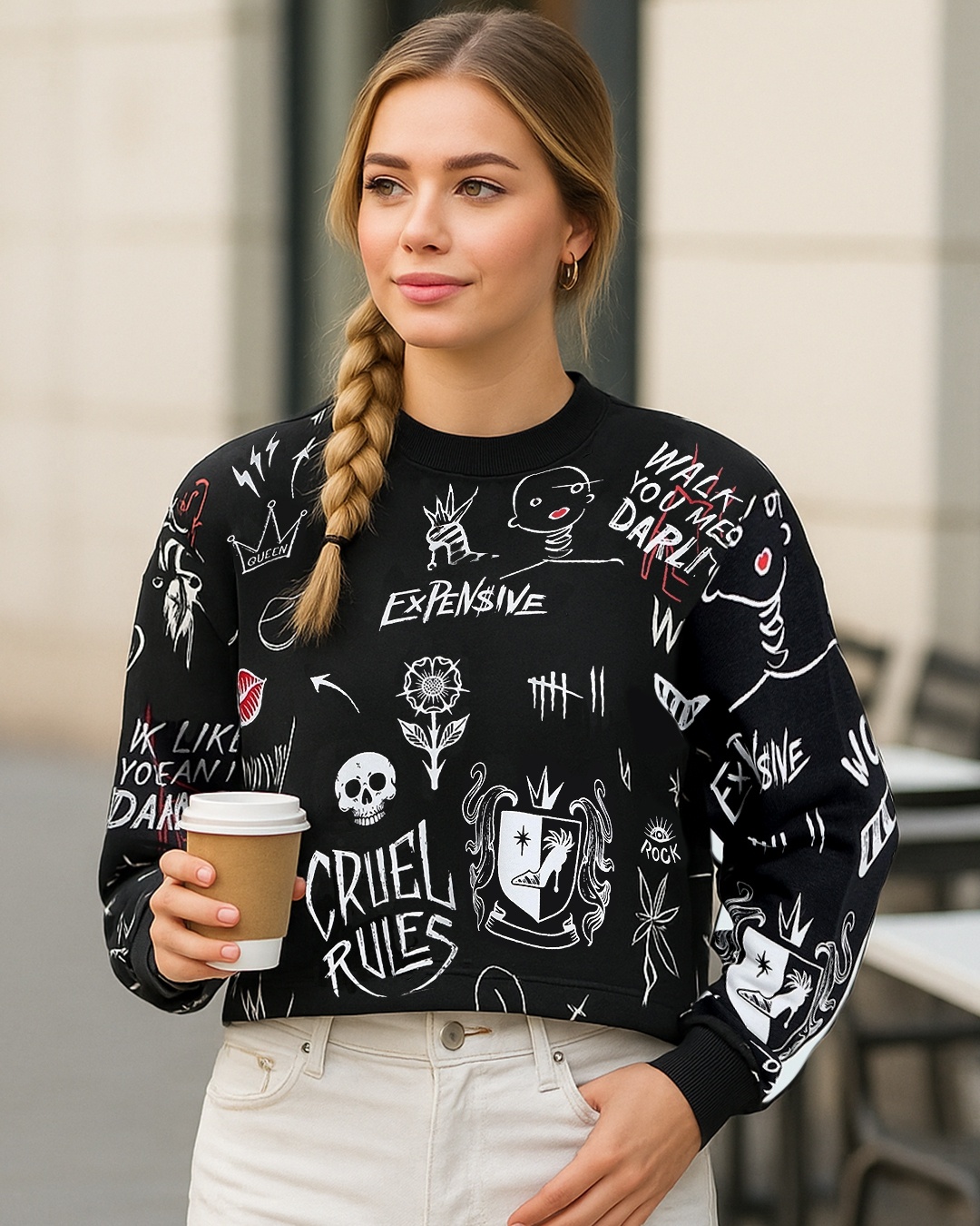 Women's Black All Over Printed Oversized Cropped Sweatshirt