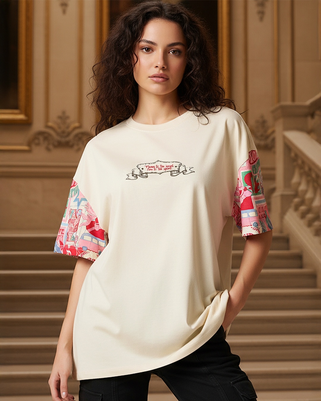 Women's Beige Graphic Printed Oversized T-shirt